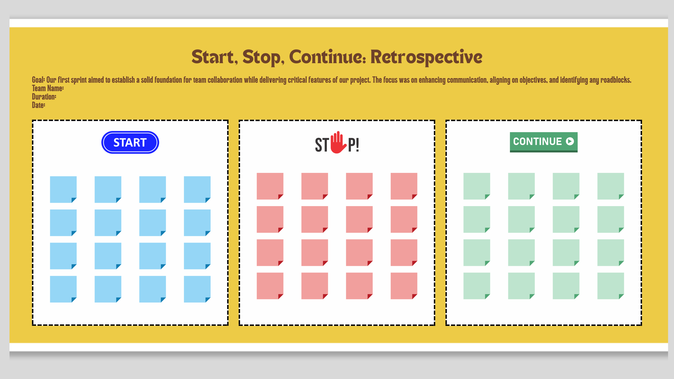 Description: This retrospective goal focuses on driving continuous improvement by identifying key actions for the team to start, stop, and continue. It aims to enhance productivity, streamline workflows, and reinforce successful strategies, creating a more efficient and aligned team dynamic for future sprints.